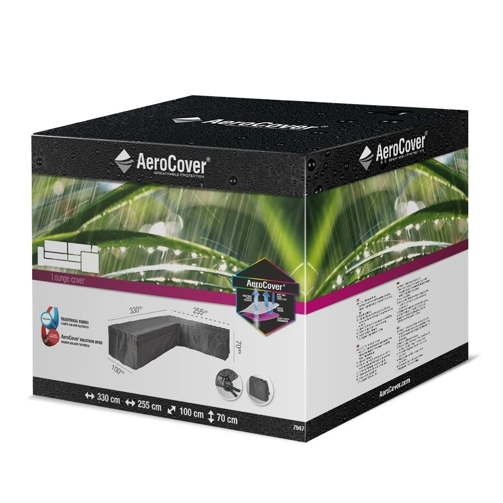 AeroCover loungesethoes voor hoeksets. Ademende loungesethoes voor loungeset links in L-vorm 330x255x100xH70. Loungesethoes o.a. geschikt voor L-vormige hoeksets met een 90° hoek. Wanneer u in de set zit is de rechterzijde langer dan de linkerzijde. AeroCovers zijn ademend, waterbestendig, reduceren condensvorming en gaan schimmelvorming tegen. De stof heeft een hoge kleurechtheid dankzij de door en door geverfde vezels. Een AeroCover hoes verlengt de levensduur van uw tuinmeubelen. AeroCovers zijn vervaardigd van sterk en lichtgewicht ripstop polyester. Ze zijn makkelijk hanteerbaar en nemen weinig ruimte in wanneer niet in gebruik. De afdekhoes is voorzien van rijgkoord met 2 stoppers voor een goede pasvorm. Inclusief handige opbergtas. AeroCover stoffen zijn 100% waterdicht, de naden zijn, net als elke ander hoes, spatwaterdicht.