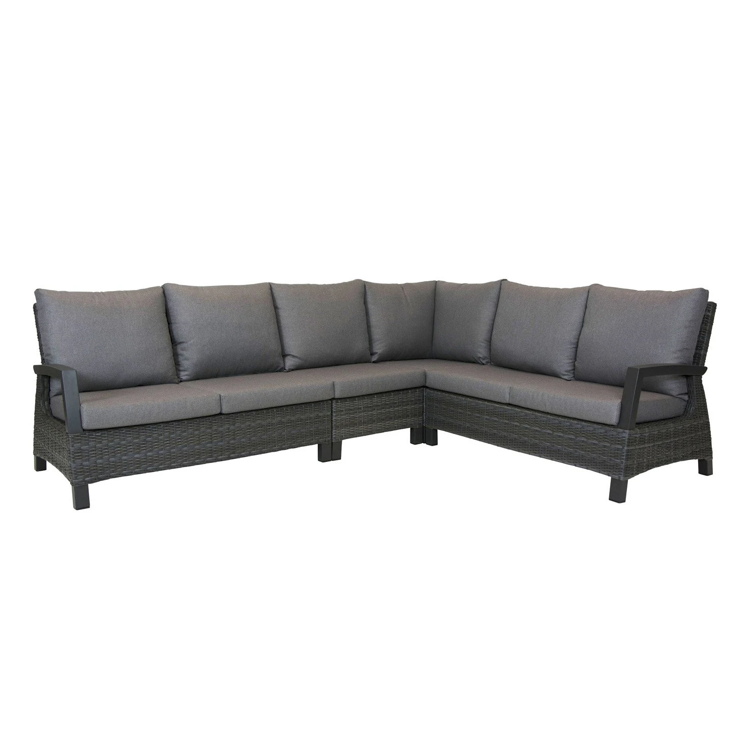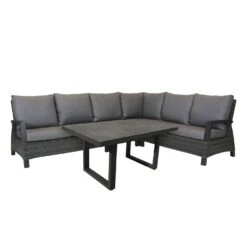 Met deze prachtige hoekbank uit de LISSABON serie van Royal Seasons kun je eindeloos genieten in de tuin. De hoekbank bestaat uit hoogwaardig wicker met een antraciet afwerking. Het aluminium frame is licht in gewicht, erg sterk en gemakkelijk in onderhoud. Daarom wordt aluminium veel gebruikt in de productie van tuinmeubelen. Deze hoekbank is een echte musthave voor op jouw terras!