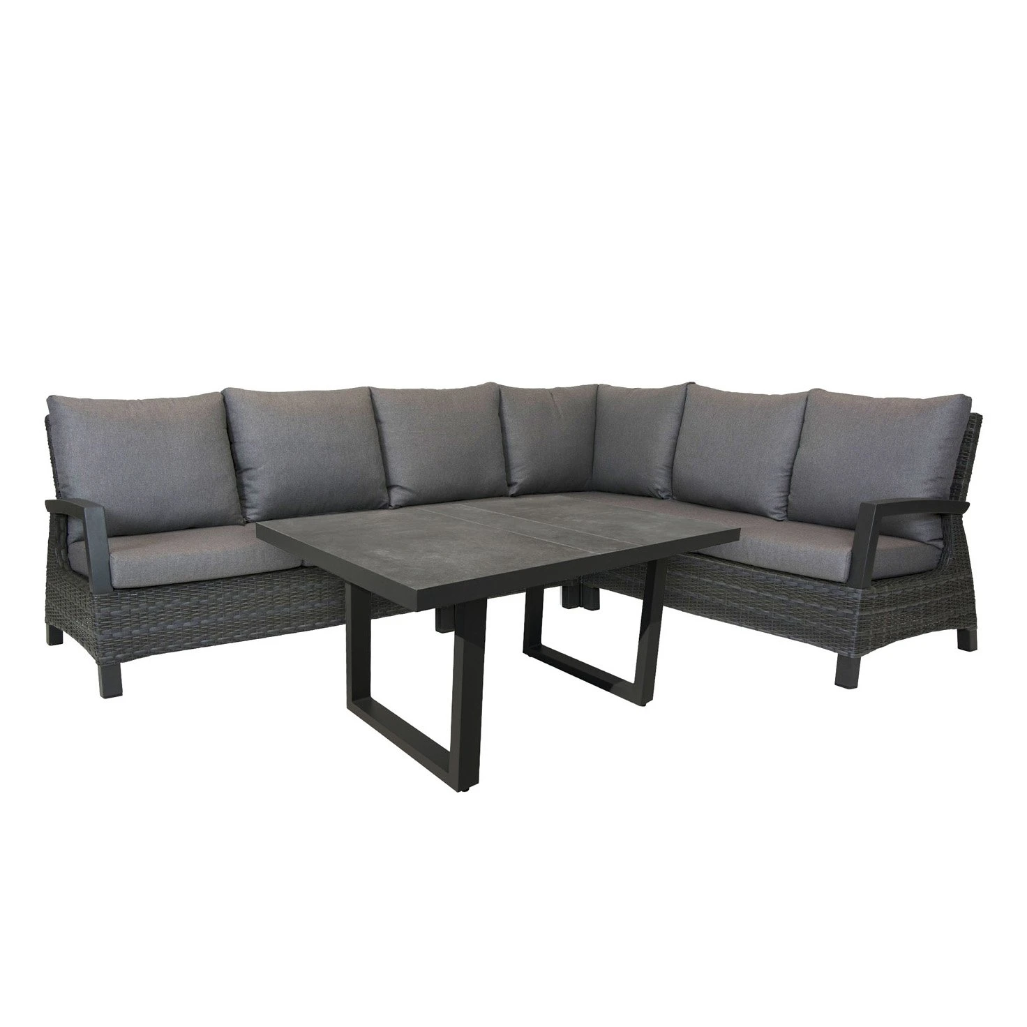 - De โHigh diningโ tafel maakt deze tuinset tot een loungeset en diningset in รฉรฉn.